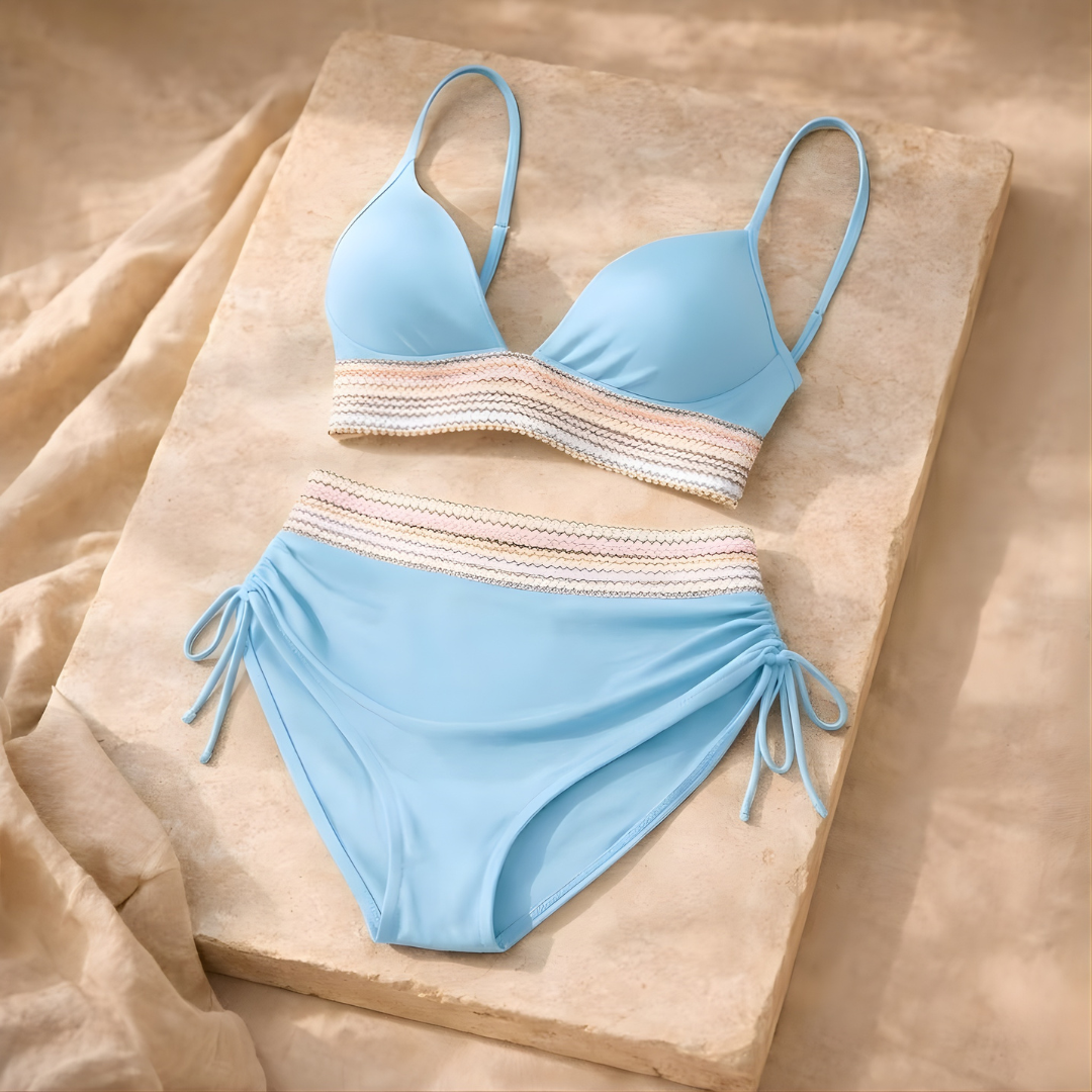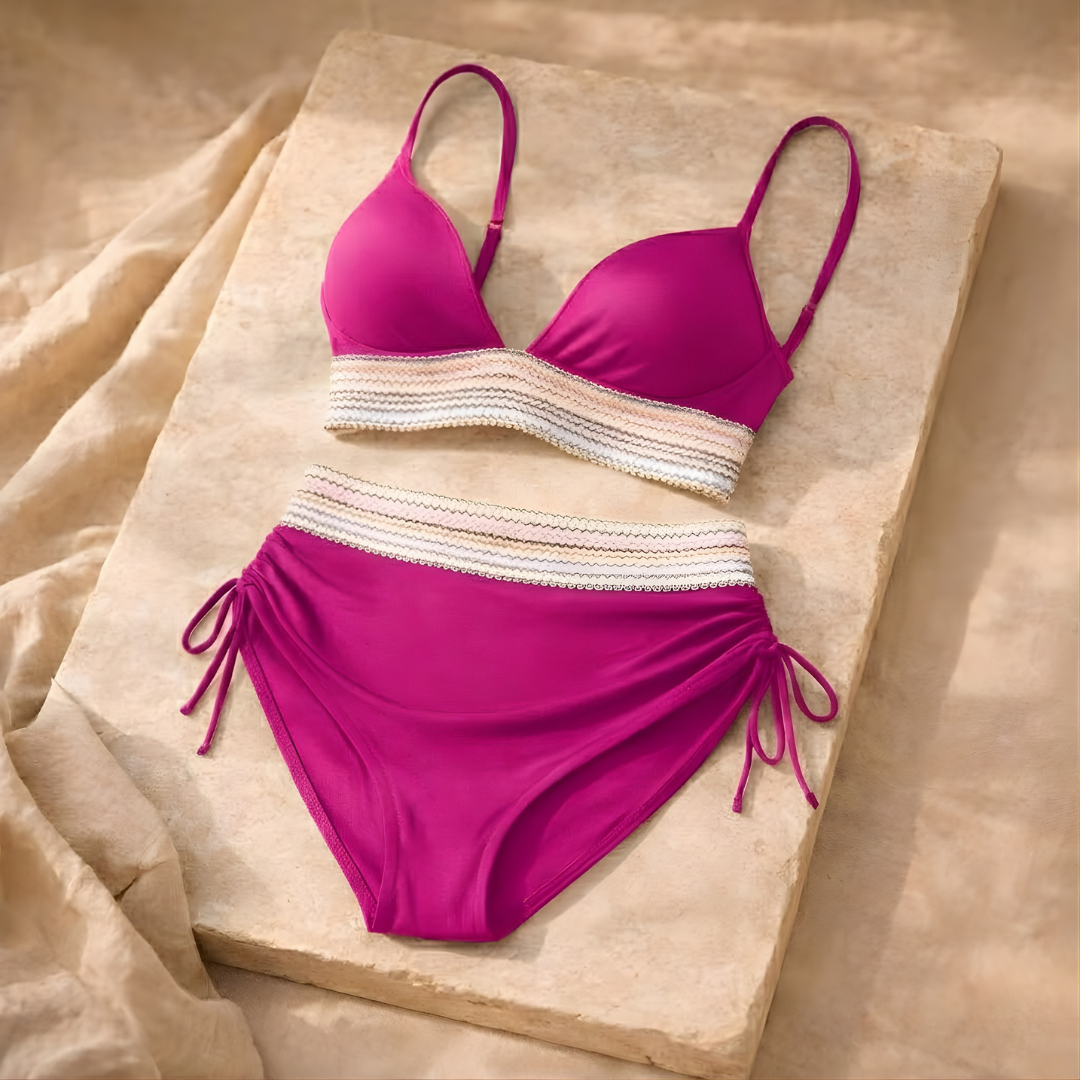 Designed to flatter and sculpt, this high-waisted bikini set combines a sleek plunge neckline with a supportive, shape-enhancing fit. The textured chevron waistband adds a refined contrast, while the adjustable side-tie bottoms ensure comfort and flexibility. Perfect for confident, elevated beach styling and modern resort wear.