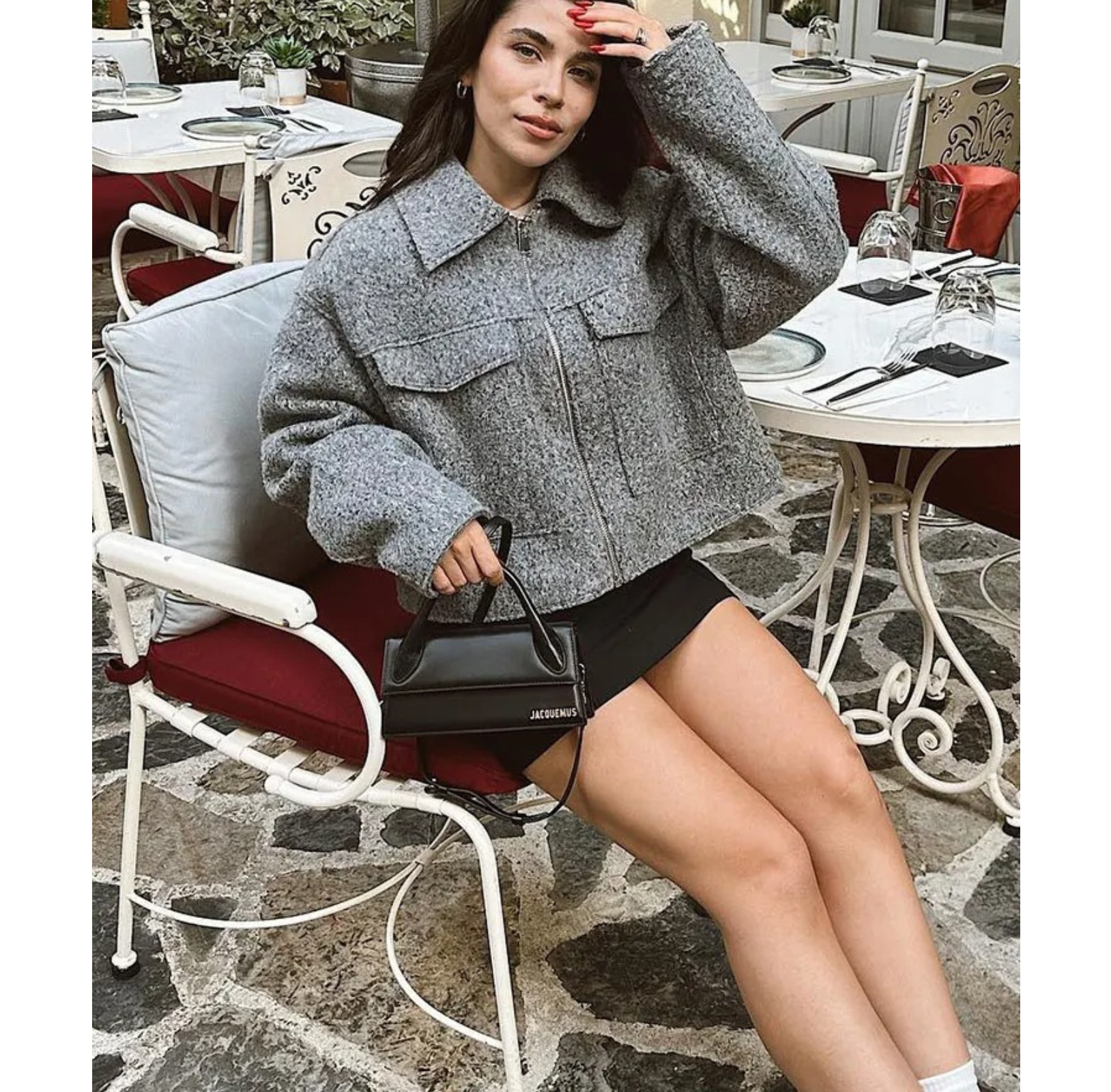 Pair the Agathe Bomber Jacket with a simple top and pleated skirt for a chic, modern look. Complete your outfit with ankle boots and a crossbody bag.