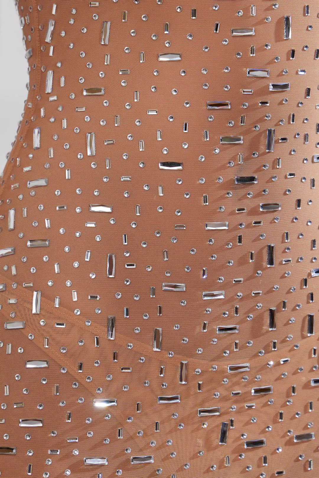 Alluring Details: Sparkling rhinestones, sheer mesh panels, and a back cut-out add a bold, luxurious touch.