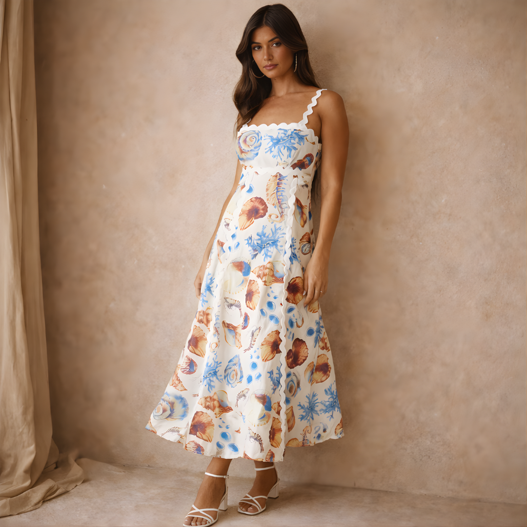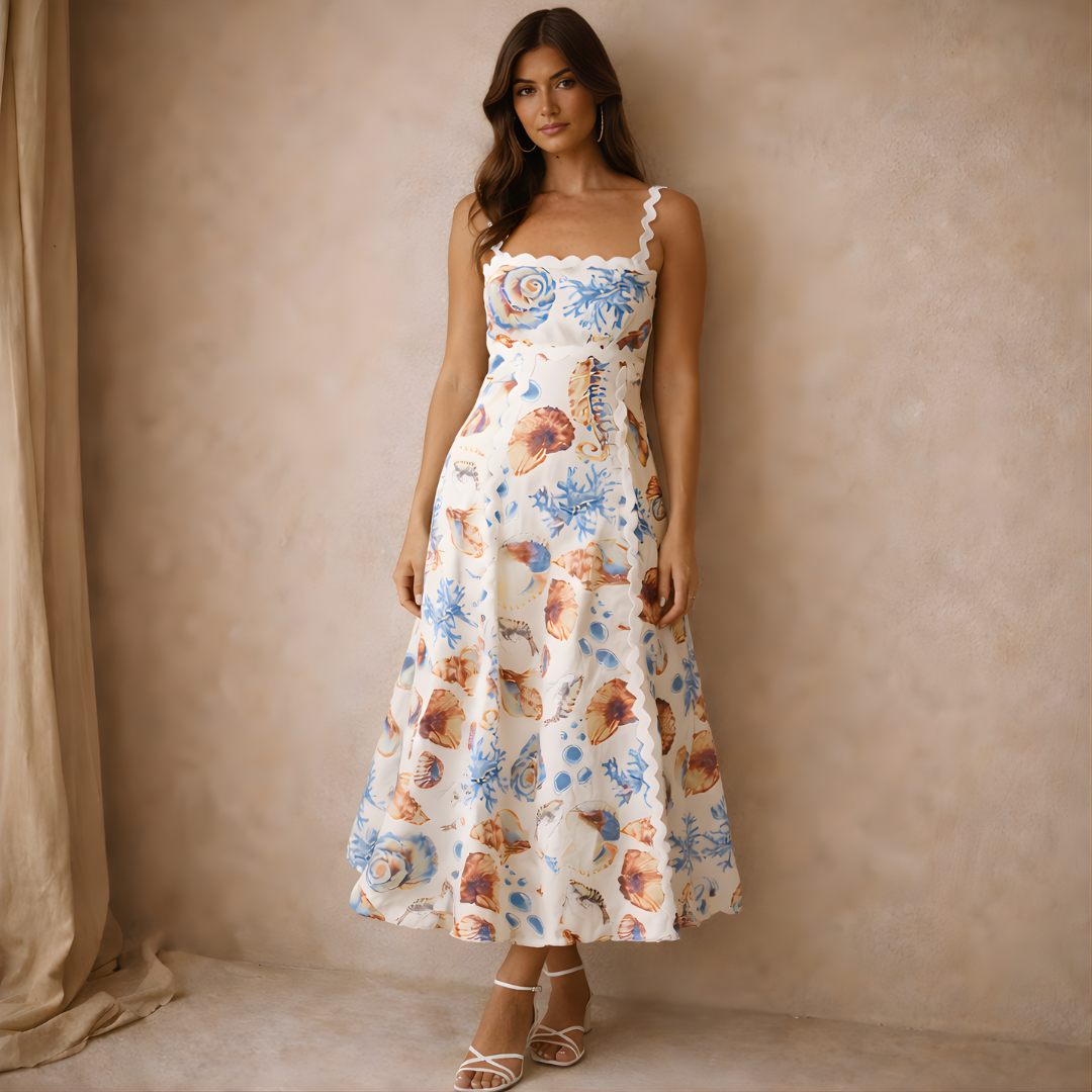 This printed summer midi dress captures the spirit of timeless femininity and relaxed elegance. The softly structured bodice flows into a graceful skirt, creating a silhouette that feels both flattering and effortlessly refined.