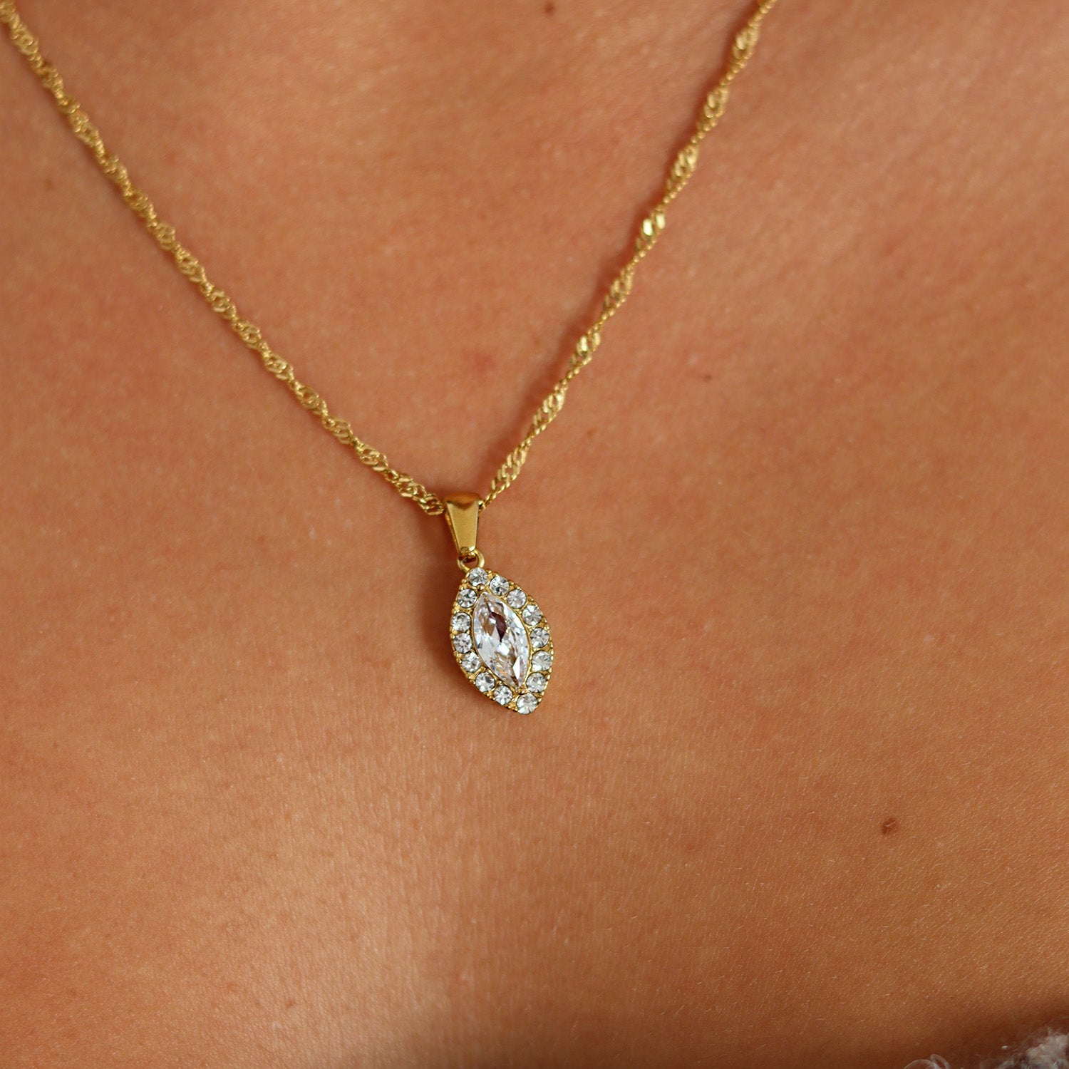 White cubic zirconia set in a spindle-shaped pendant